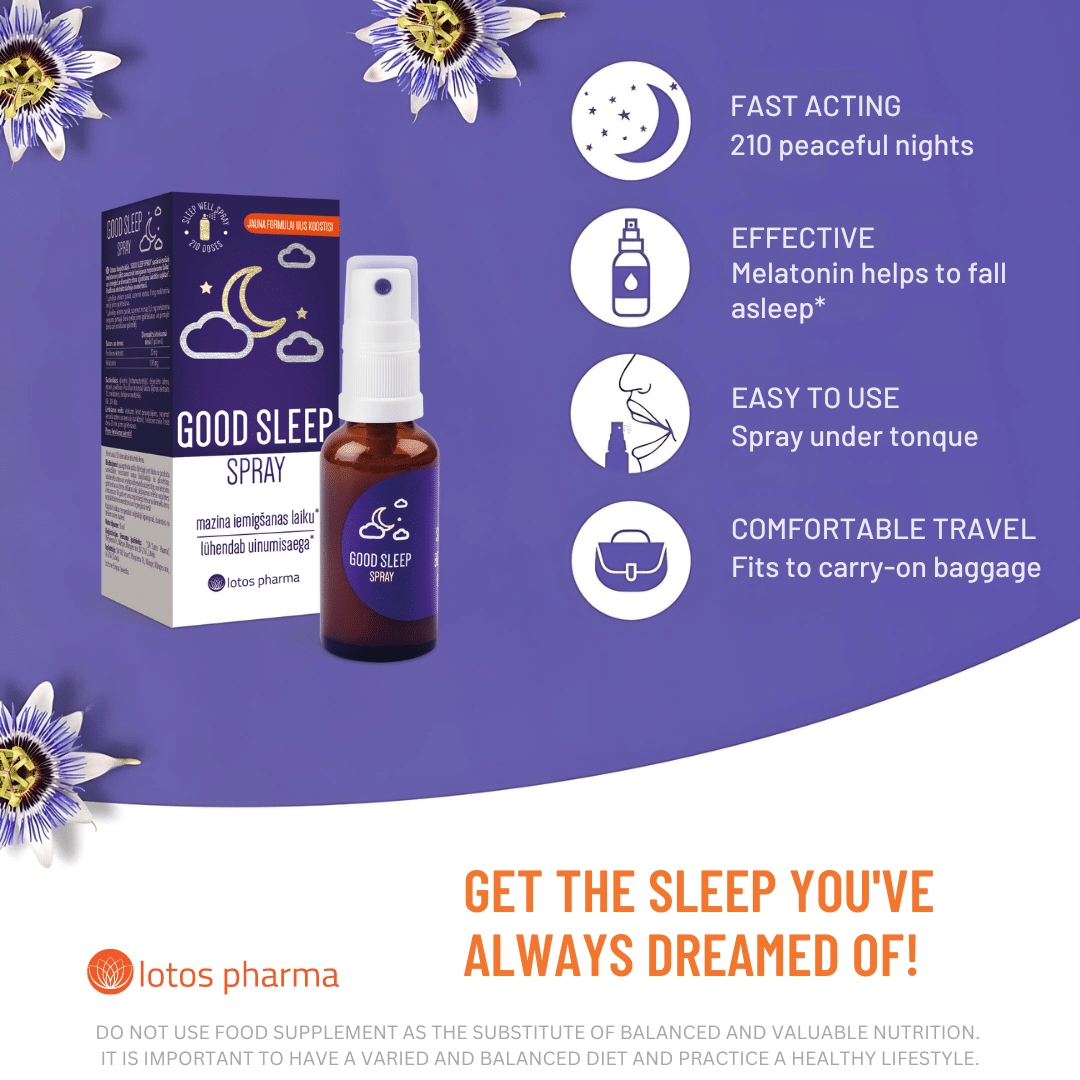 Good Sleep Spray is the first sublingual sleeping aid whose melatonin content helps to reduce the time required to fall asleep¹ and ease the feelings associated with disruption of the circadian rhythm², while the passionflower plant has a sedative effect and helps maintain mental relaxation and healthy sleep.