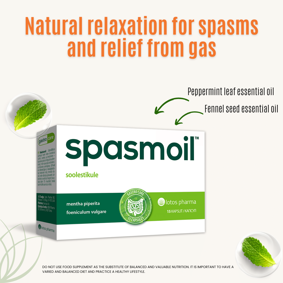 In addition to the tips above, a natural food supplement called Spasmoil can also be helpful. It contains essential oils of peppermint and fennel, which relax the digestive tract and reduce gas. Peppermint soothes bloating and nausea while promoting bowel movements, and fennel supports digestion and relieves constipation. Spasmoil capsules can be taken preventively before meals or when digestive discomfort has already arisen.