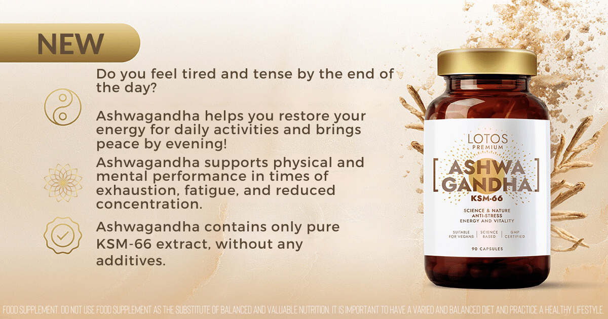 LOTOS PREMIUM Ashwagandha KSM-66 containing ashwagandha contributes to the body’s resistance to stress, contributes to emotional balance and general wellbeing, has tonic effect. 2x 90 capsules for 6 months usage.