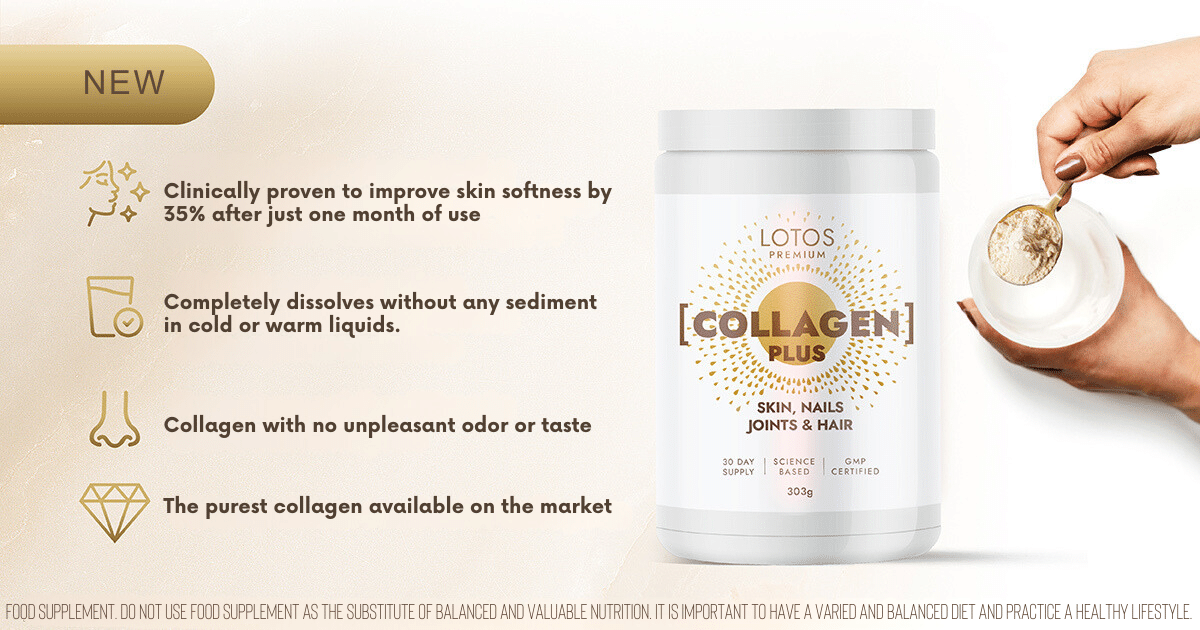 2x LOTOS PREMIUM COLLAGEN PLUS contains collagen, one of the most important structural proteins in the human body. It is found in the skin, hair, nails, ligaments, tendons, bones, joint cartilage, digestive system, and cardiovascular system. Vitamin C contributes to normal collagen formation for the normal function of skin, blood vessels, bones and cartilage, to normal energy-yielding metabolism as well as to the reduction of tiredness and fatigue.