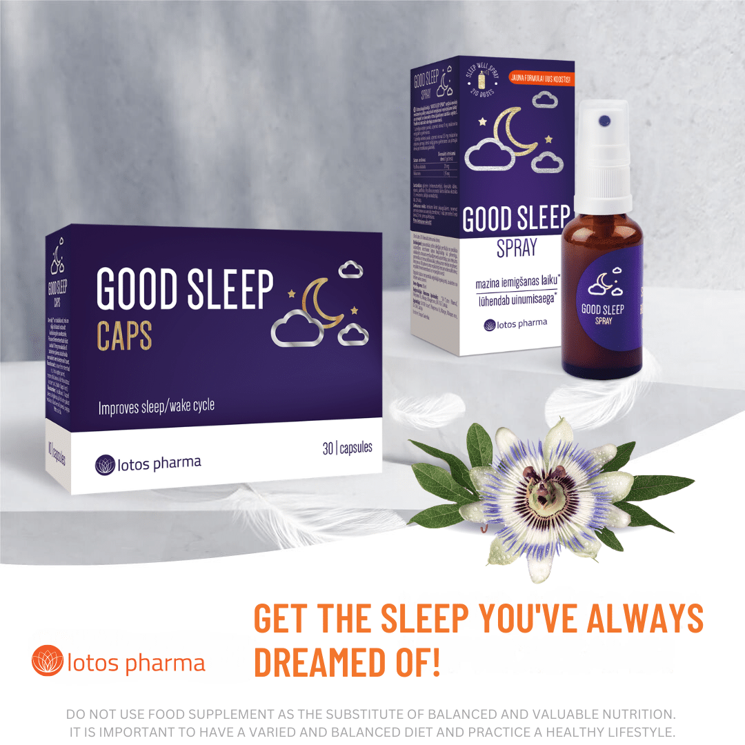 In addition to traditional herbal remedies, you can also try modern preparations. The Latvian pharmaceutical company Lotos Pharma, in cooperation with specialists, has developed Good Sleep Spray and Good Sleep Caps capsules for sleep with melatonin and plant extracts. Good Sleep Spray is the first under-the-tongue sleep aid, the passionflower plant in its composition has a sedative effect and helps maintain mental relaxation and healthy sleep. On the other hand, the melatonin in the composition helps to reduce the time needed to fall asleep* and helps to relieve the feelings associated with the disruption of the circadian rhythm**
