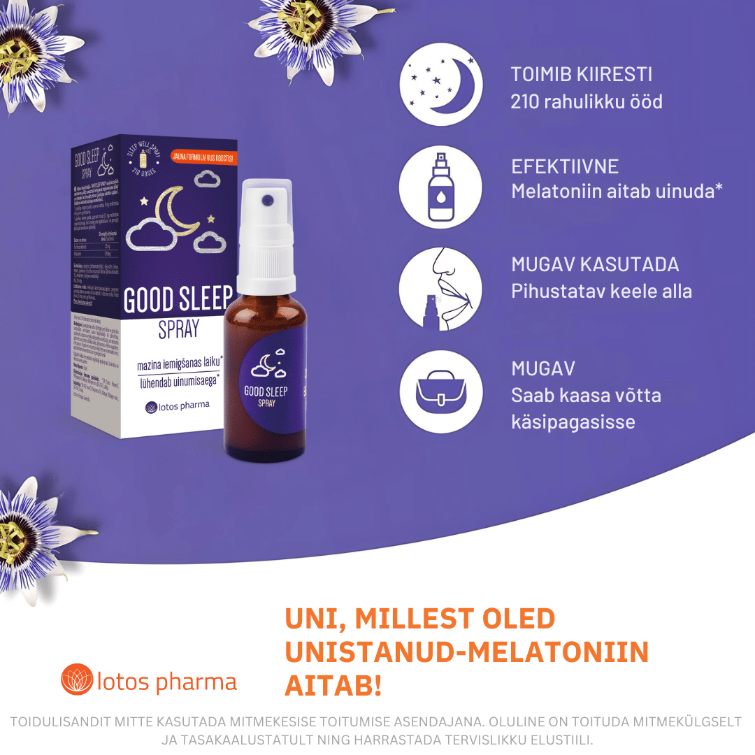 Good Sleep Spray on esimene keelealune uneabi, mille melatoniinisisaldus aitab lühendada uinumiseks vajalikku aega¹ ja leevendada ööpäevase rütmi häirest tingitud tundeid², samal ajal kui kannatuslille taim omab rahustavat toimet ja aitab säilitada vaimset lõõgastust ja tervislikku und.